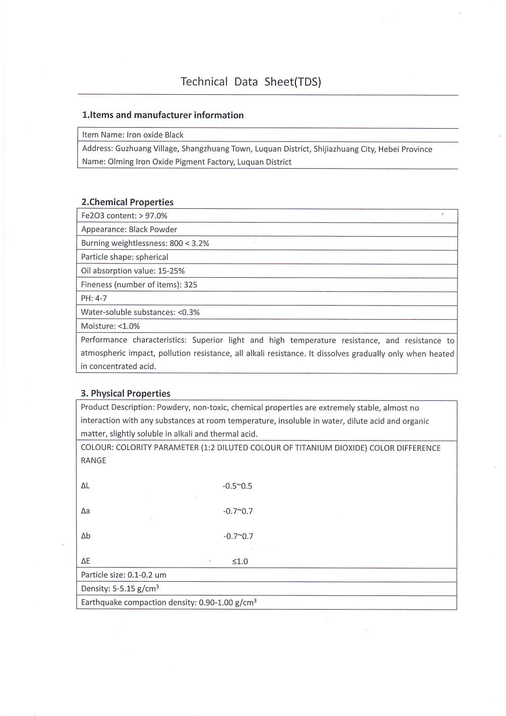 Iron oxide black, also known as magnet, magnet, black iron oxide, is a black crystal with magnetic properties, so it is also called magnetic iron oxide. This material is soluble in acid solution and easily soluble in water, alkali solution and organic solvents such as ethanol and ether.2、The main features of iron oxide black