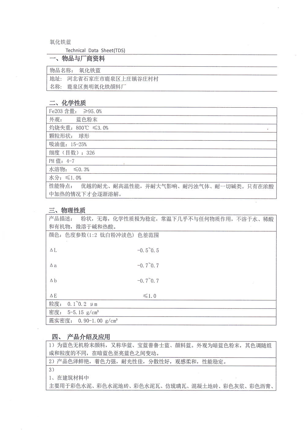色澤鮮艷,著色力強,遮蓋力略差。粉質(zhì)較堅硬,耐光性好,耐堿性差,耐熱度較高,溫度超過150度以上失去結(jié)晶水開始分解為紅色顏料。三、氧化鐵藍(lán)顏料產(chǎn)品優(yōu)勢