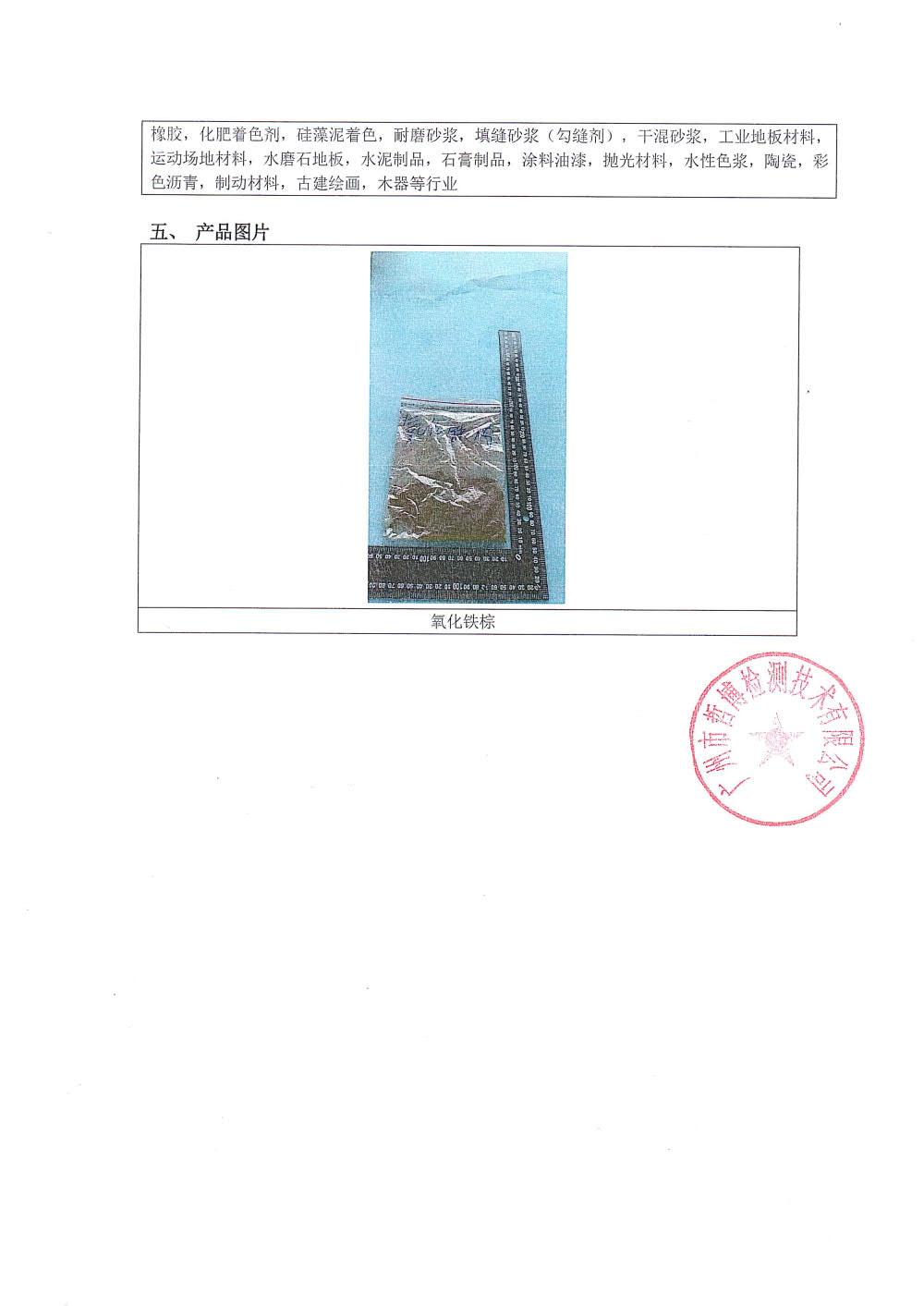 物質(zhì)特性: 顏色有黃棕、紅棕和深棕系列顏色。具有良好的顏料特性和化學(xué)性能,著色力、遮蓋力均很高,耐候、耐光性優(yōu)異。不溶于堿,在一定的酸度范圍內(nèi)性能穩(wěn)定,在濃鹽酸中可完全溶解。